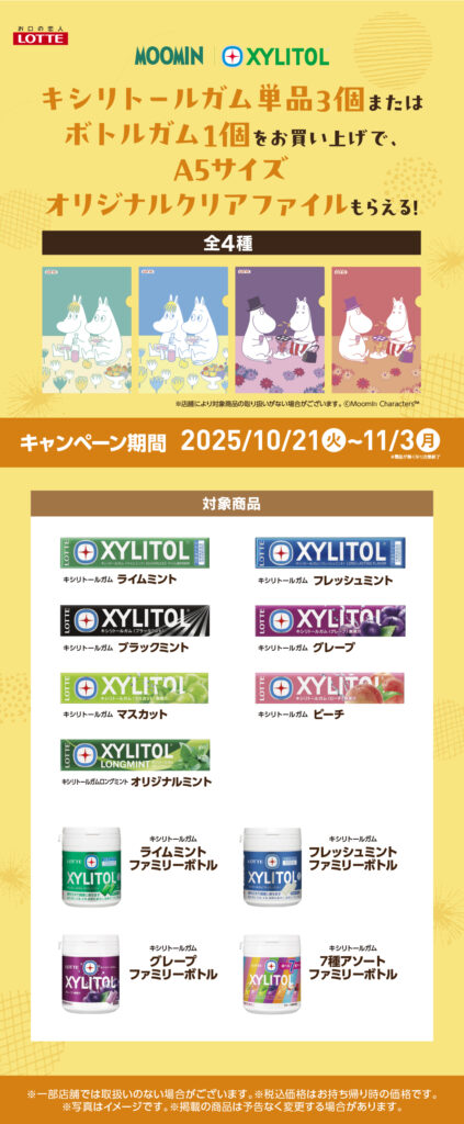 デイリーヤマザキで「ムーミン」A5クリアファイルもらえる! ロッテ キシリトールガム コラボキャンペーンが2025年10月21日スタート。クリアファイルは全4種類