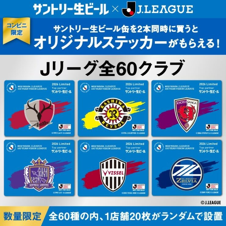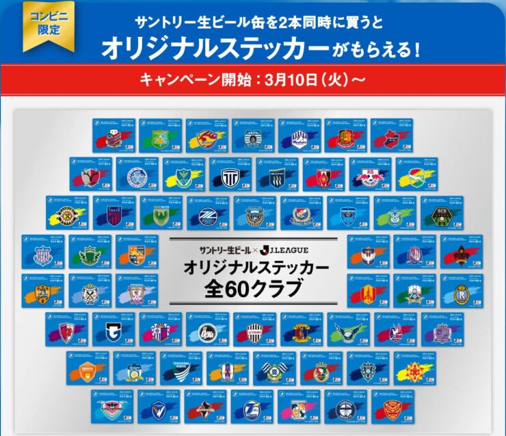 セブンイレブン 2026年3月8日 セブンイレブンで「Jリーグ」全60クラブのコラボ ステッカーもらえる! サントリー生ビール購入キャンペーンが3月10日スタート。各店で“全60種から20枚がランダム”で設置