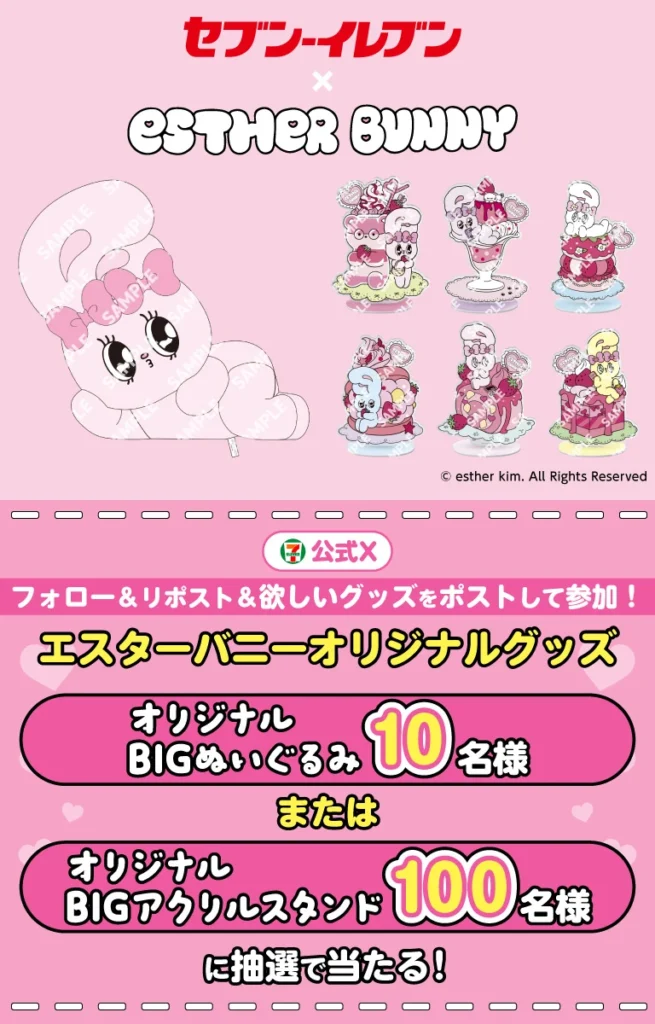 セブンイレブン NEW 2026年3月4日 「エスターバニー × セブンイレブン コラボグッズ」が当たる! セブンイレブンがX(旧Twitter)フォロー&リポストキャンペーンを実施中。可愛い『BIGぬいぐるみ』『BIGアクリルスタンド』が計110名にプレゼント。応募期間は2026年3月16日まで