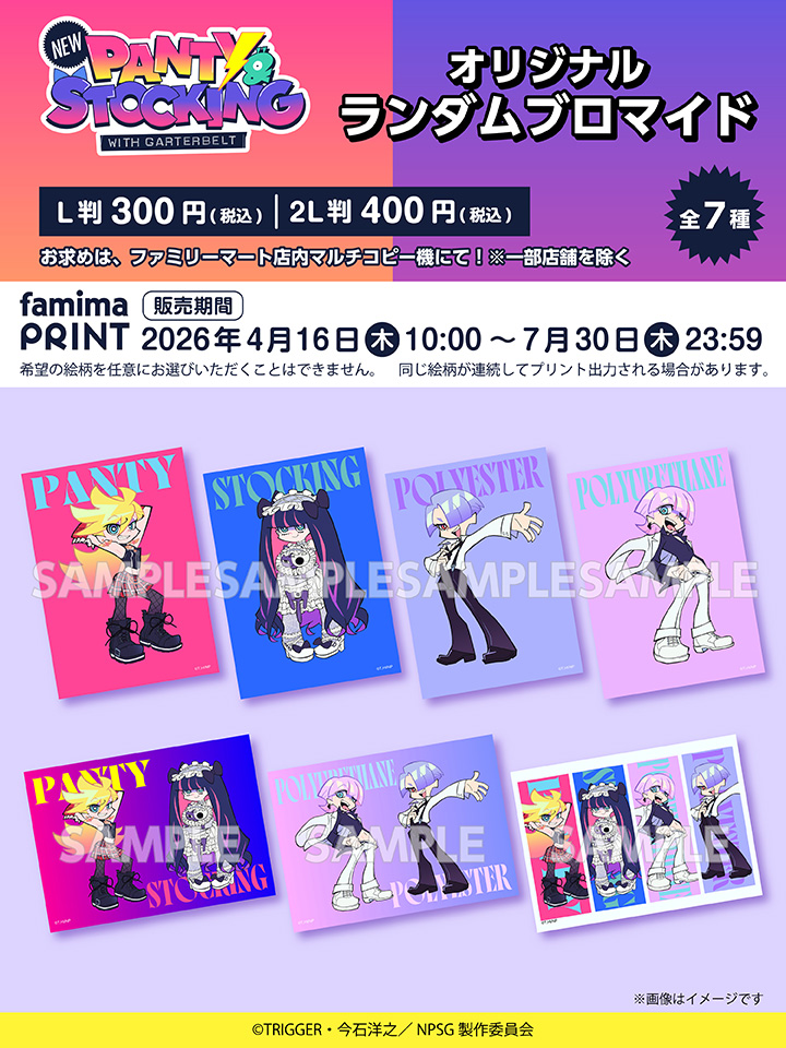 ファミリーマート NEW 2026年4月16日 ファミマで『New PANTY & STOCKING with GARTERBELT』(NEWパンスト) ランダムブロマイドが2026年4月16日発売、パンスト姉妹 / ポリポリ兄弟がファミマコラボイラストで登場。全7種から1枚がランダムでプリントアウト
