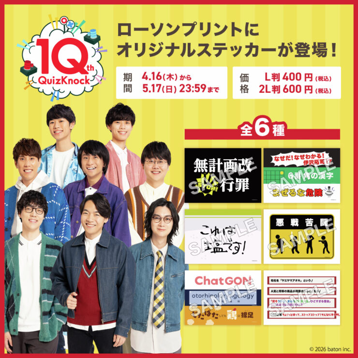 ローソン NEW 2026年4月16日 ローソンで「QuizKnock 10周年プロジェクト オリジナルステッカー」が2026年4月16日発売、全6種の中から好きな1枚を選んで購入可能。2024年に登場した一部ステッカーも復刻
