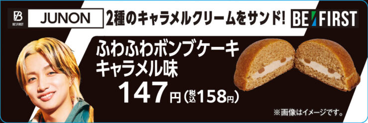 JUNONさん監修「ふわふわボンブケーキ キャラメル味」は、ふんわりとしたキャラメル味のボンブケーキに2種のキャラメルクリームをサンドしたというコラボスイーツ。発売日は12月2日(火)、価格は158円(税込)。