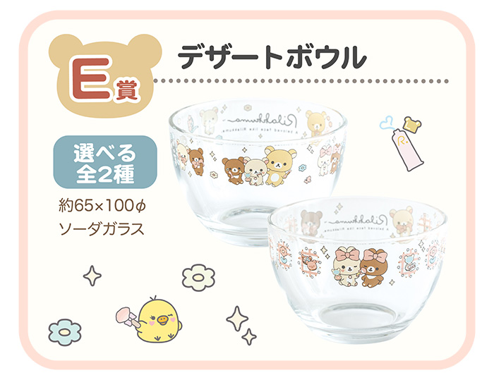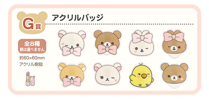 賞品はA賞~G賞とラストリラッくじ賞が用意され、A賞~C賞はコリラックマ / チャイロイコグマの「ぬいぐるみ」、D賞はリラックマの「ぬいぐるみバッジ」、E賞~G賞はリラックマたちがデザインされた「デザートボウル」「エッグブラシ」「アクリルバッジ」となっています。