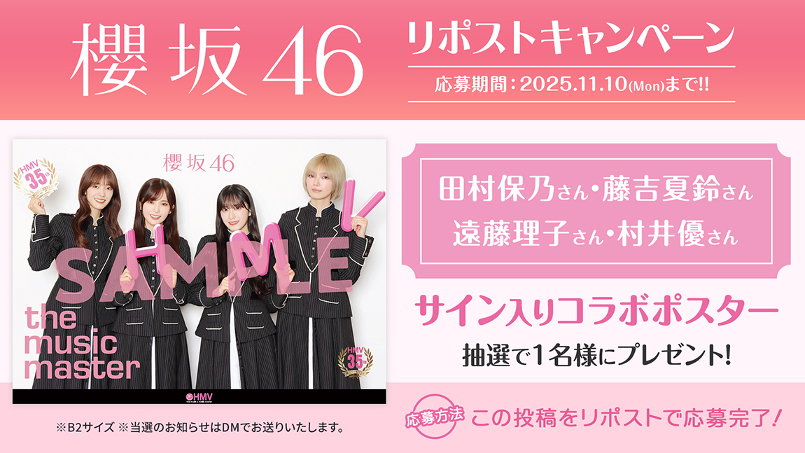 櫻坂46×HMVキャンペーンに先駆けて、田村保乃さん、藤吉夏鈴さん、遠藤理子さん、村井優さんの「サイン入り櫻坂46撮りおろしコラボポスター」が当たるX(Twitter)リポストキャンペーンが10月21日(火)から実施。