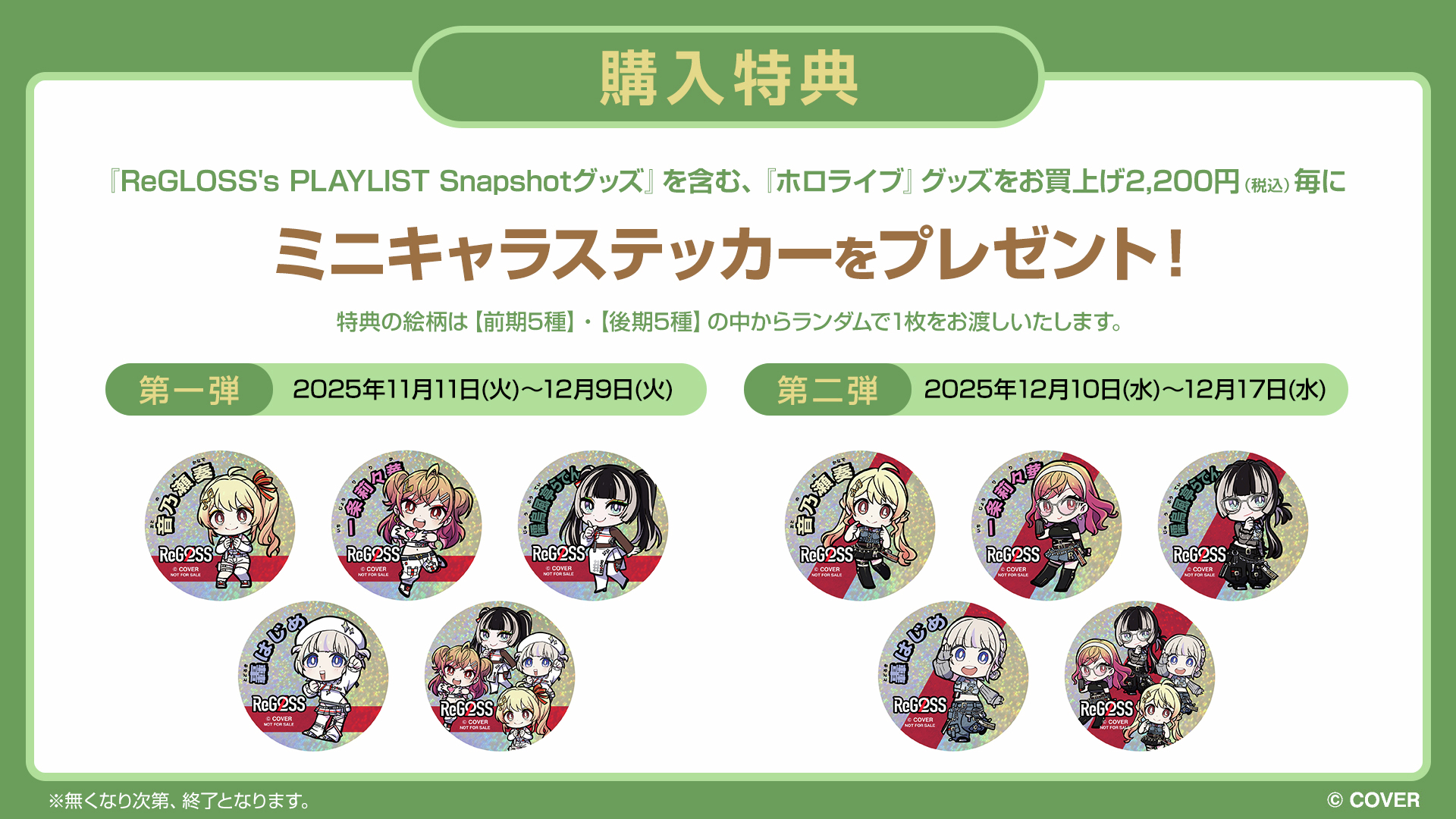 全国のHMVならびにHMV&BOOKS店頭で上記のReGLOSS Snapshotグッズを含む「ホロライブグッズ」を2,200円(税込)購入する毎に、「ReGLOSS ミニキャラステッカー」(前期5種/後期5種、各ランダム)をもらえるキャンペーンが11月11日(火)からスタート。
