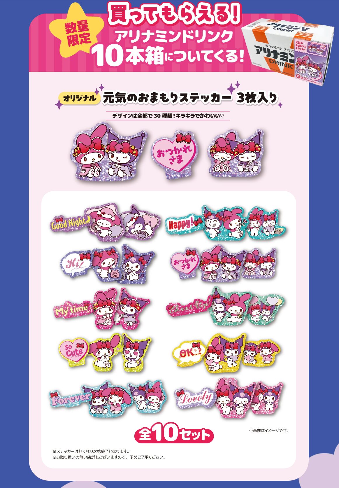 このほか、マイメロちゃん&クロミちゃんの「元気のおまもりステッカー 3枚入り」が付いたアリナミンドリンク 10本箱が11月1日(土)から数量限定で登場。