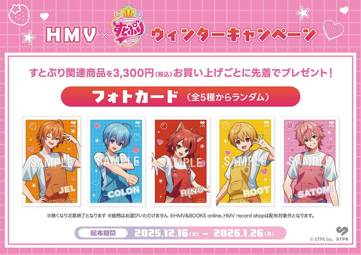今回の「HMV×すとぷり ウィンターキャンペーン」は、全国のHMVならびにHMV&BOOKS店頭で「すとぷり関連商品」を3,300円(税込)以上購入する毎に、「すとぷり フォトカード」(全5種/ランダム)をもらえるというもの。