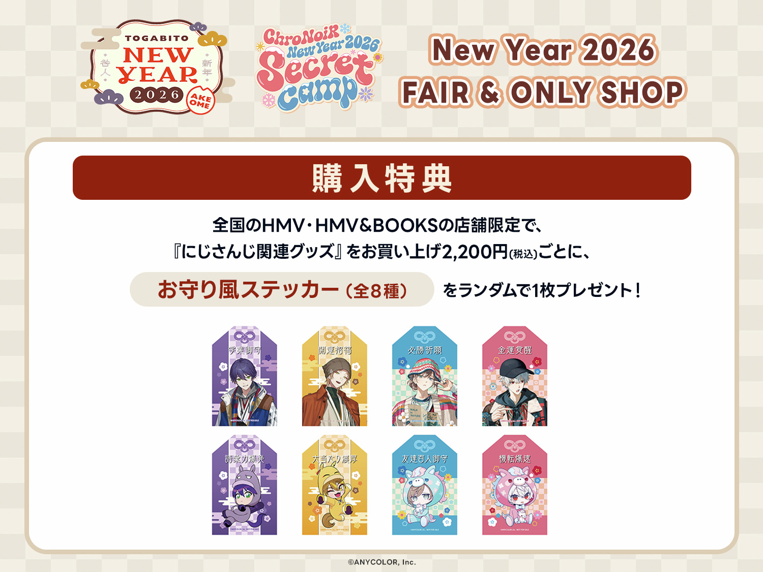全国のHMVならびにHMV&BOOKS店頭で「にじさんじ関連グッズ」を2,200円(税込)購入する毎に、「お守り風ステッカー」(全8種/ランダム)をもらえるキャンペーンが2026年1月2日(金)から実施。