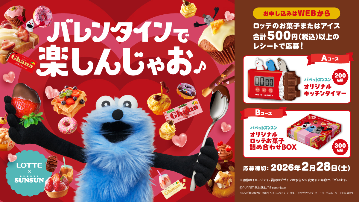 2026年のバレンタインに向けて「ロッテ×パペットスンスン バレンタインで楽しんじゃお♪」キャンペーンが2026年1月5日(月) 10:00から始まっています。