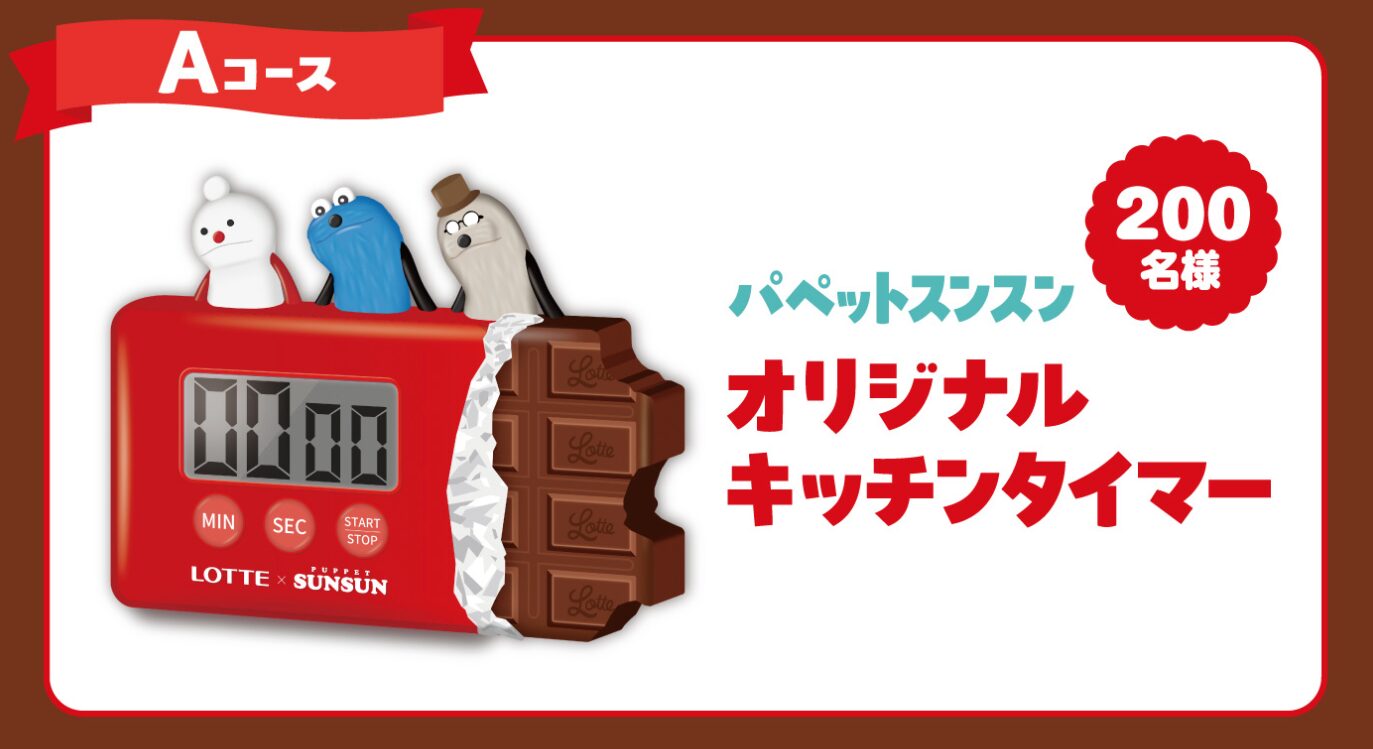 スンスンコラボグッズはAコース「パペットスンスン オリジナルキッチンタイマー」と、Bコース「パペットスンスン オリジナルロッテお菓子詰め合わせBOX」 が用意され、Aコースは抽選で200名に、Bコースは抽選で300名に当たります。