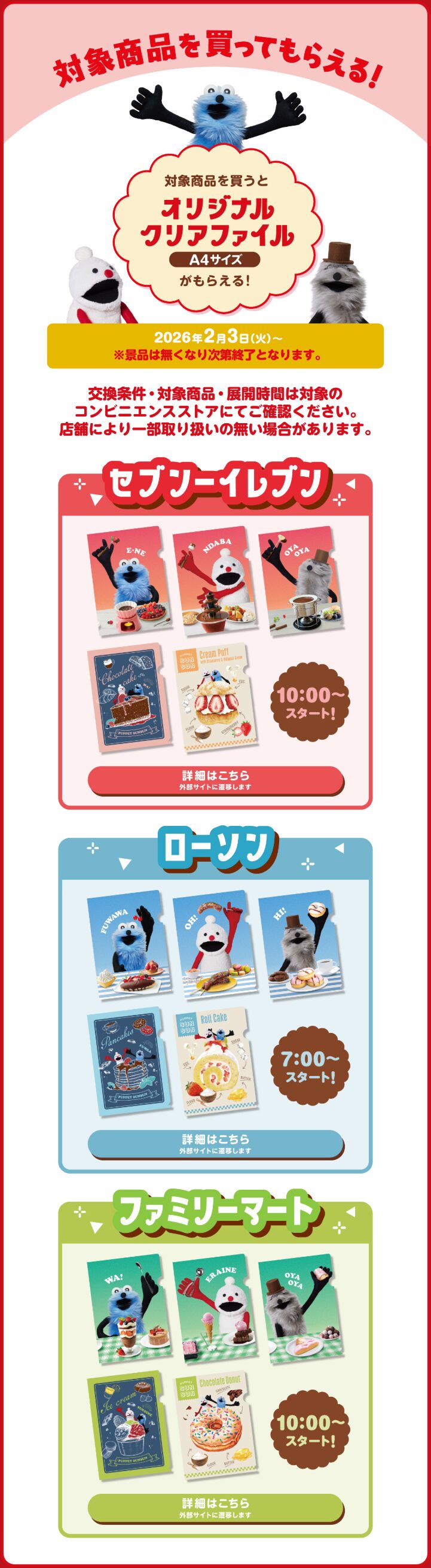 コンビニで対象商品を購入すると「パペットスンスン A4クリアファイル」プレゼント