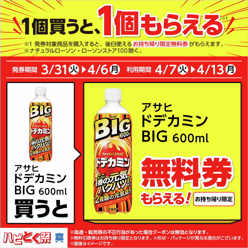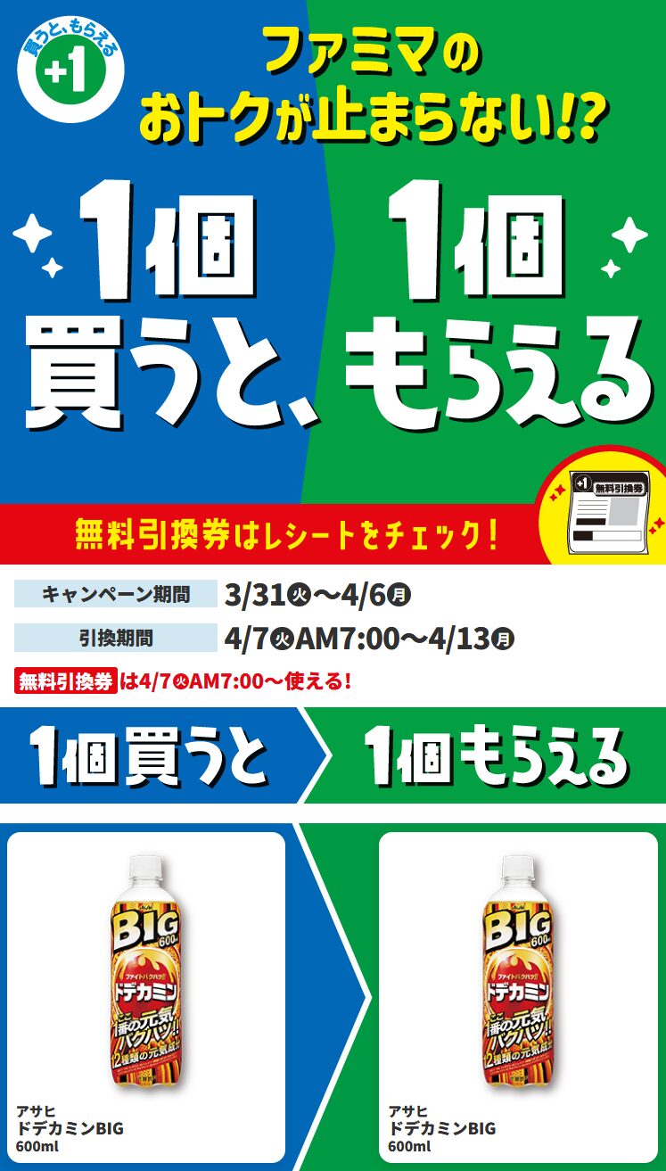 今回、ローソン / ファミリーマートで実施されているキャンペーンは、期間中に「アサヒ飲料 ドデカミン BIG 600ml」を購入すると、後日、同じ商品と引き換えできる無料券(レシートクーポン)が発行されるというもの。