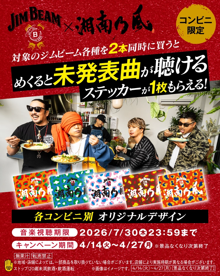 コンビニ限定「湘南乃風×ジムビーム めくると未発表曲が聴けるステッカーが1枚もらえる! キャンペーン」が2026年4月14日(火)からスタートします。
