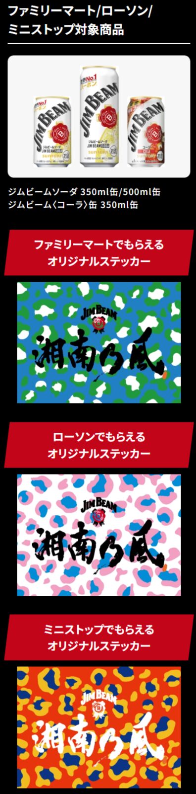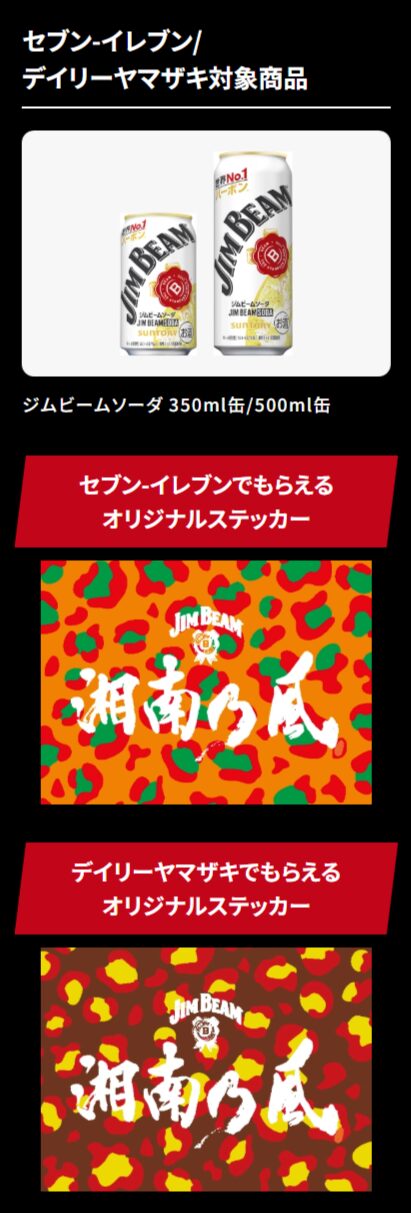 今回のキャンペーンは、対象のコンビニでサントリーの「ジムビーム」を2本購入すると、「湘南乃風 未発表曲を聴けるステッカー」(全5デザイン / コンビニ別)を1枚もらえるというもの。