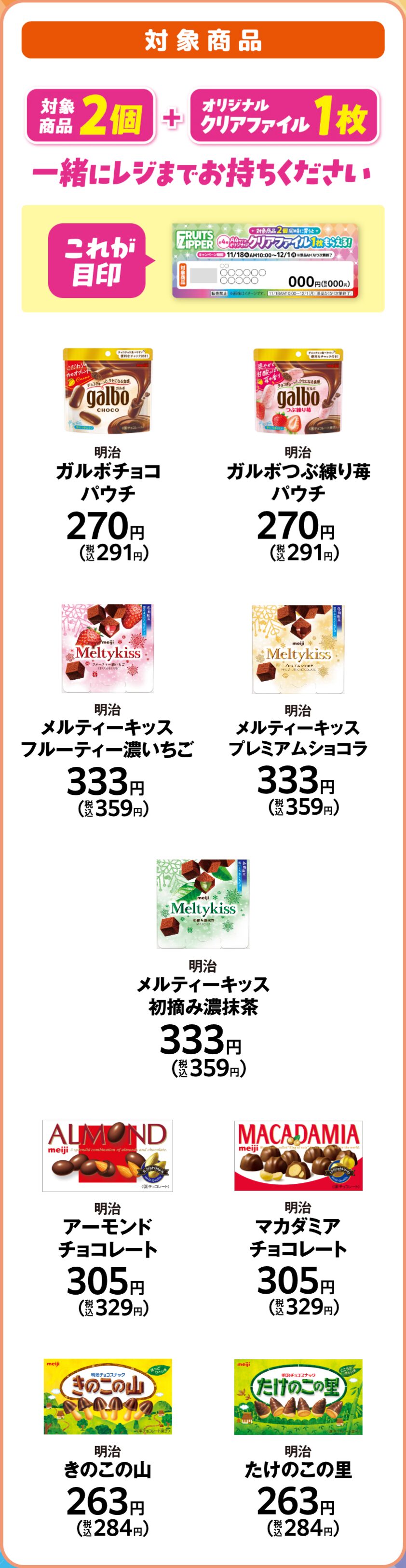 今回のキャンペーンは、期間中にファミリーマートで対象の明治のお菓子一度に2個購入すると、「FRUITS ZIPPER A4サイズオリジナルクリアファイル」(全4種)を1枚もらえるというもの。