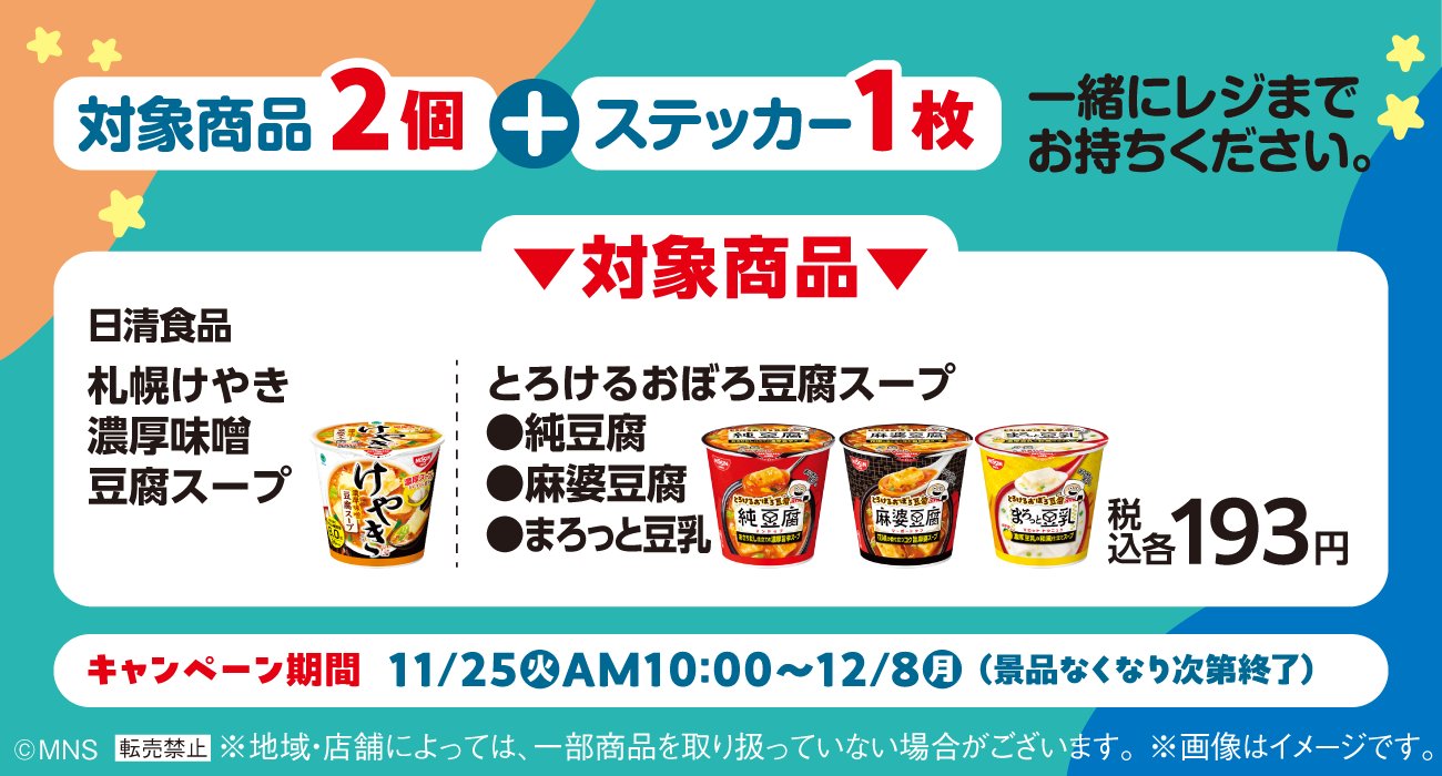 対象商品は「日清食品 札幌けやき 濃厚味噌豆腐スープ」「日清食品 とろけるおぼろ豆腐スープ 純豆腐」(各税込193円)など。配布期間は12月8日(月)までとされていますが、期間内であっても景品がなくなり次第、終了となります。
