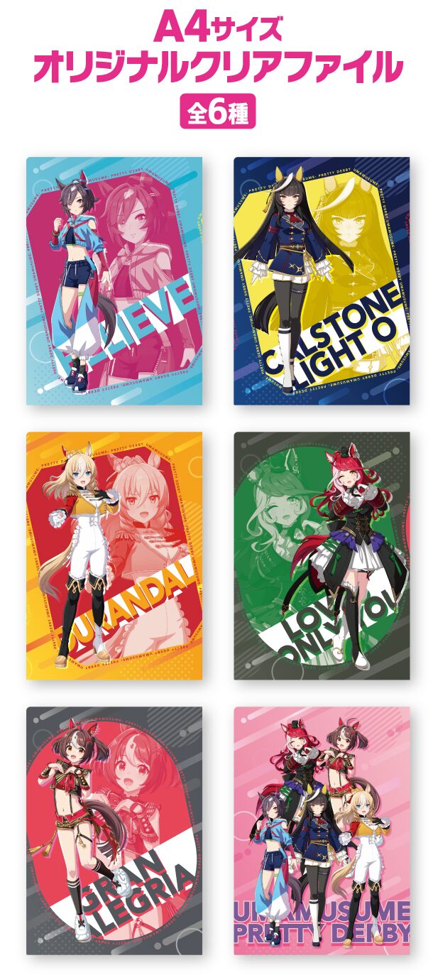 クリアファイルは「ビリーヴ」「カルストンライトオ」「デュランダル」「ラヴズオンリーユー」「グランアレグリア」の単独デザインが1種類ずつと「集合」デザインが1種の全6種類が用意され、好きなキャラクター・デザインを選んでもらえます。