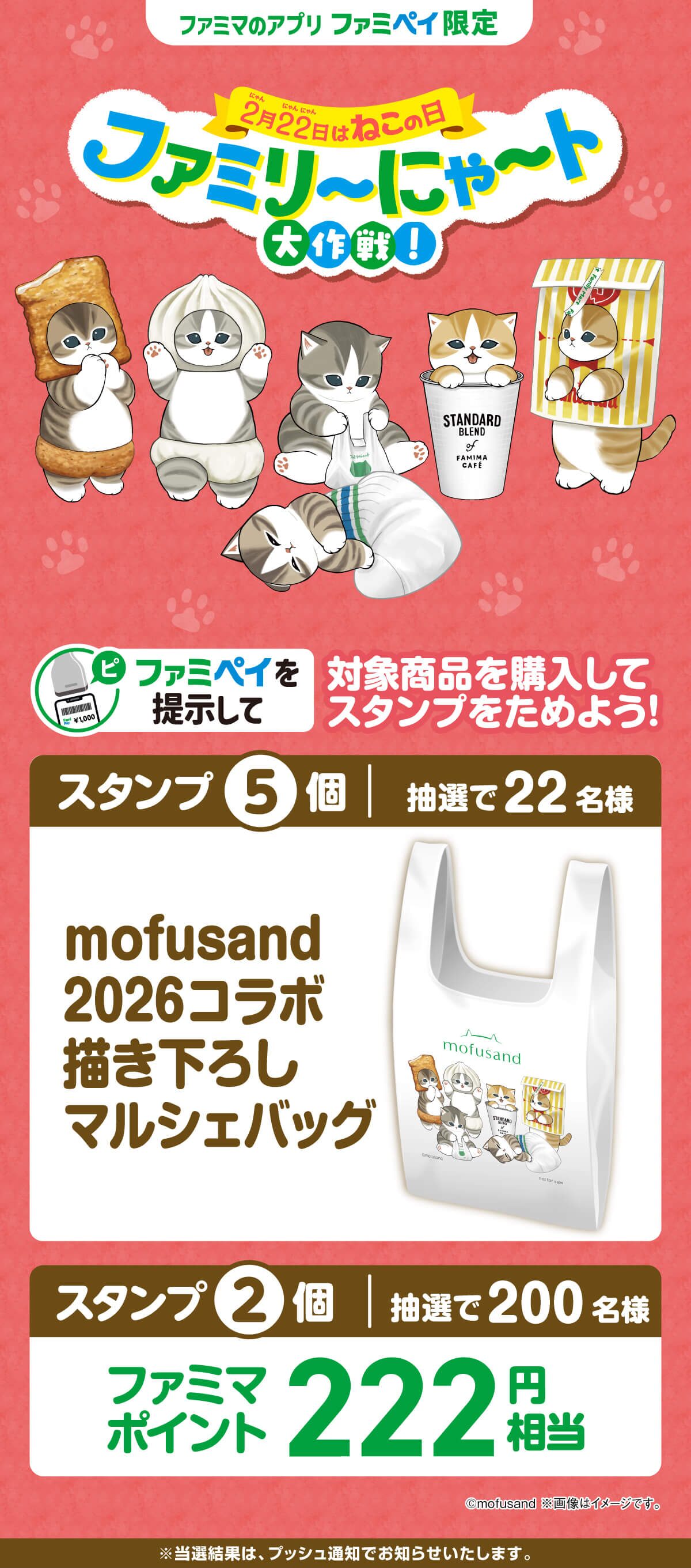 前述の「mofusando」コラボ商品13品を1点購入につきスタンプが1個たまり、スタンプ5個で「mofusand 2026コラボ 描き下ろし マルシェバッグ」(抽選で22名)、スタンプ2個で「ファミマポイント 222円相当」(抽選で200名)が当たる抽選に応募できます。