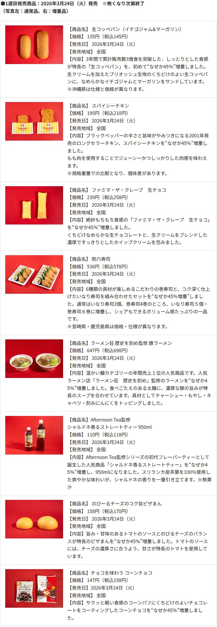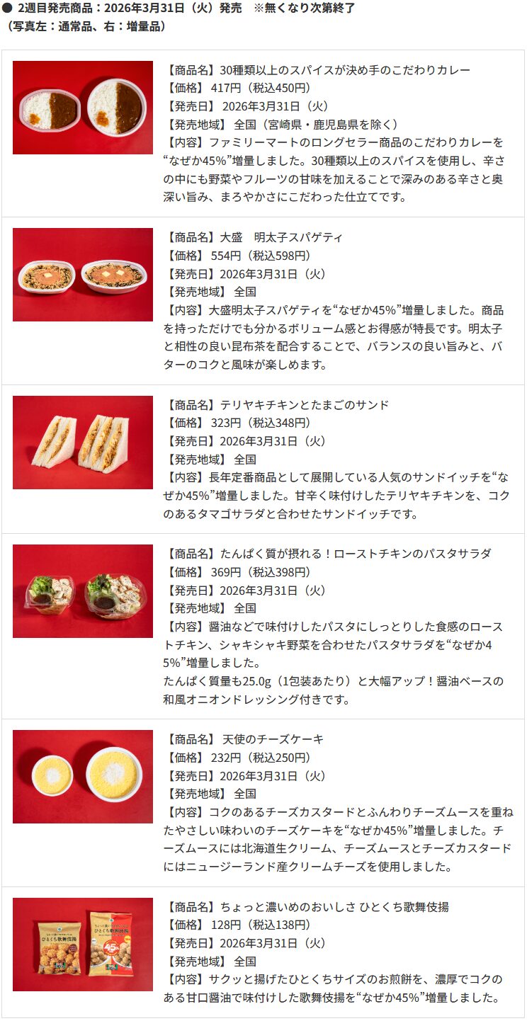 2026年3月24日(火)から2週間にわたって実施され、価格据え置きで重量などが45%増量されたスイーツ・フライドチキン・パン・ラーメンなど計14品が登場します。