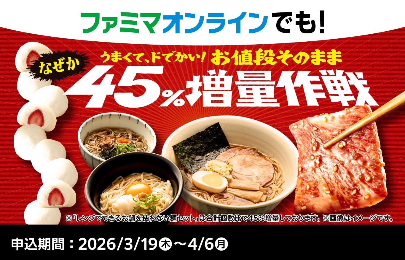ファミマ店頭の「お値段そのまま なぜか45%増量作戦」に先駆けて、ファミマのECサイト・ファミマオンラインでも増量作戦が3月19日(木)からスタート。