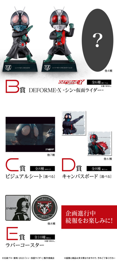 賞品ラインアップは「A賞:SOFVICS 仮面ライダー」、「B賞 DEFORME-X -シン・仮面ライダー-」など。