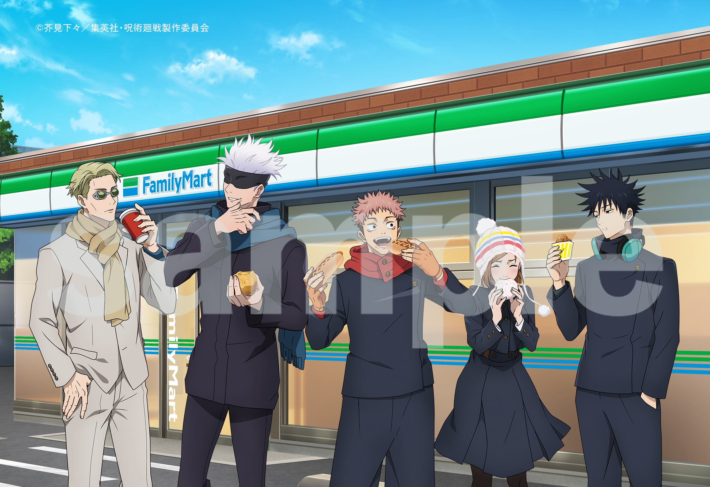 期間中はファミリーマート 銀座木挽町通り店の店舗外観に乙骨憂太、夏油傑、五条悟が描かれるほか、店内にも他人気キャラクターが各所に装飾されるそうです。