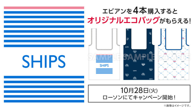 今回のキャンペーンは、期間中にローソンで「伊藤園 エビアン 330ml」(税込135円)を一度に4本購入すると、「SHIPS オリジナルエコバッグ」(全3種)を1個もらえるというもの。