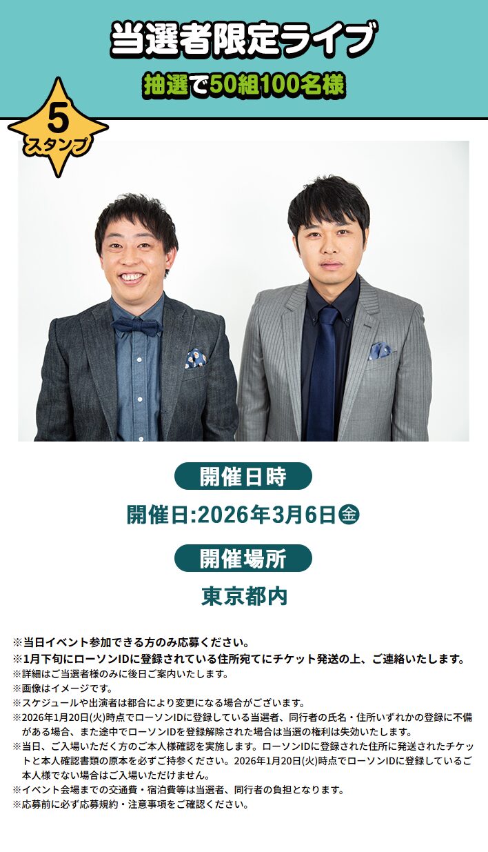 • 5スタンプで応募「さらば青春の光 当選者限定ライブチケット」:抽選で50組/100名