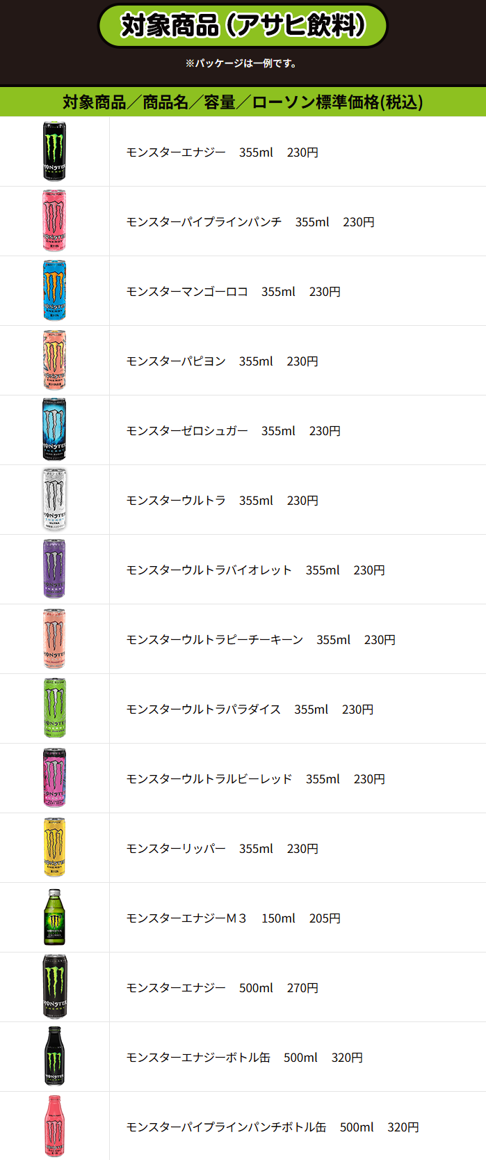 ローソンアプリに登録したポイントカード(Pontaカードまたはdポイントカード)を掲示して「アサヒ飲料 エナジーモンスター」シリーズを1本購入毎に1スタンプがたまり、スタンプ数に応じてライブチケットまたはコラボグッズなどが当たる抽選に挑戦できます。
