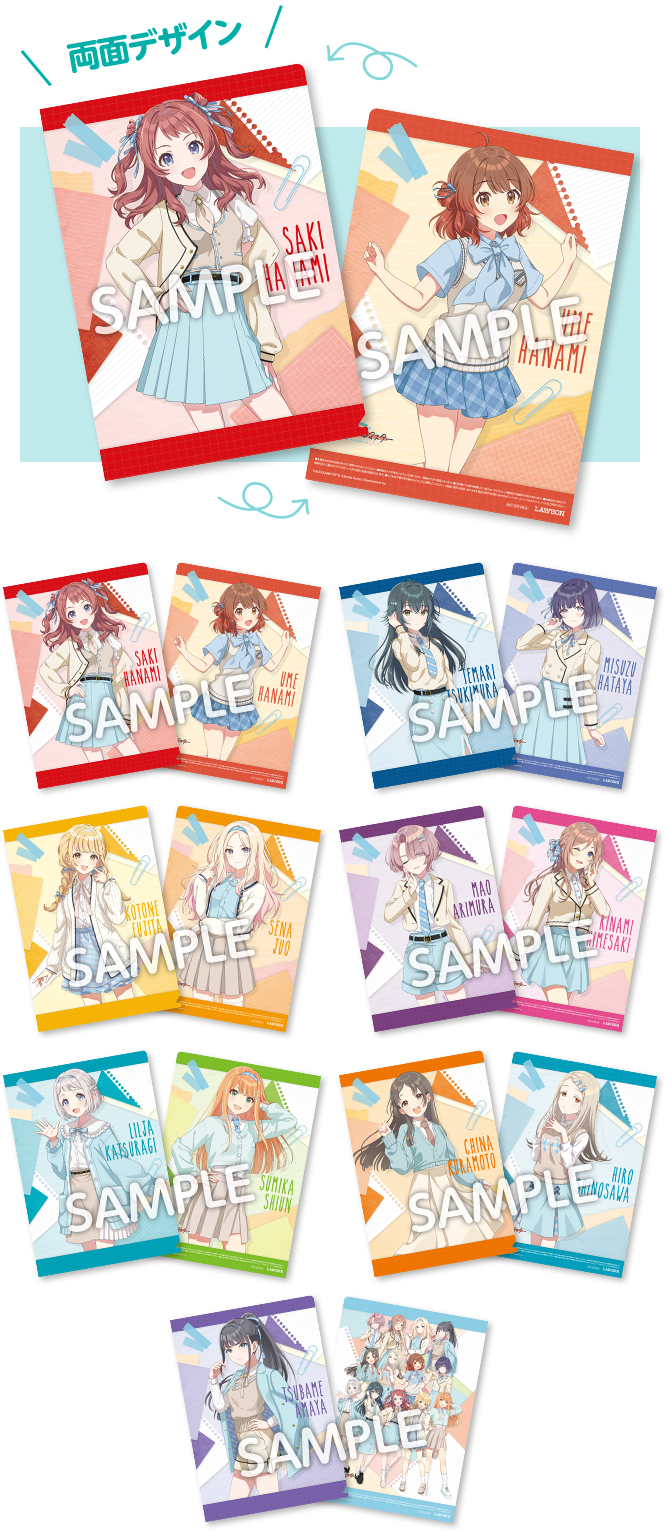 クリアファイルは「花海咲季&花海佑芽」、「月村手毬&秦谷美鈴」、「藤田ことね&十王星南」、「有村麻央&姫崎莉波」、「葛城リーリヤ&紫雲清夏」、「倉本千奈&篠澤広」、「雨夜燕&集合」の両面デザインで、全7種類がラインアップ。好きなデザインを選んでもらえます。配布枚数は各店計28枚。