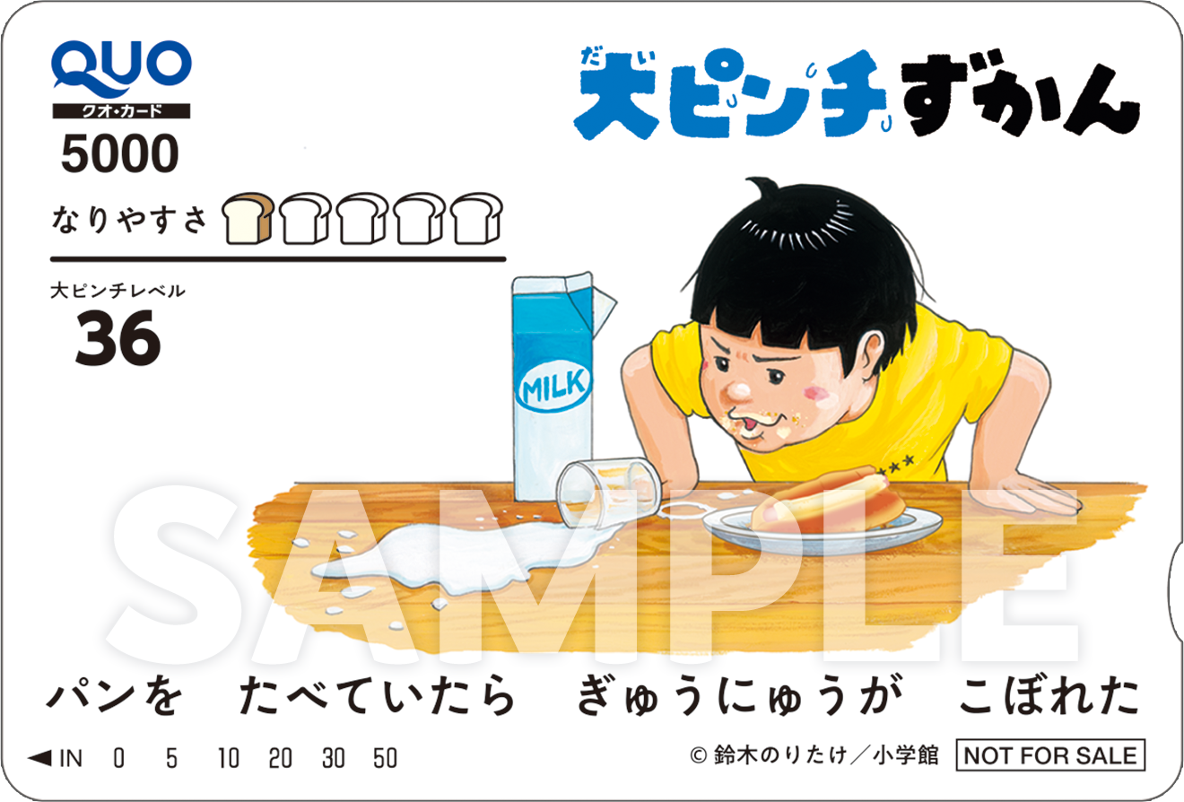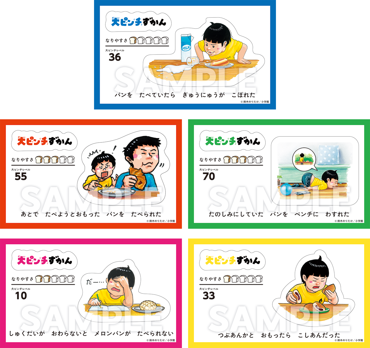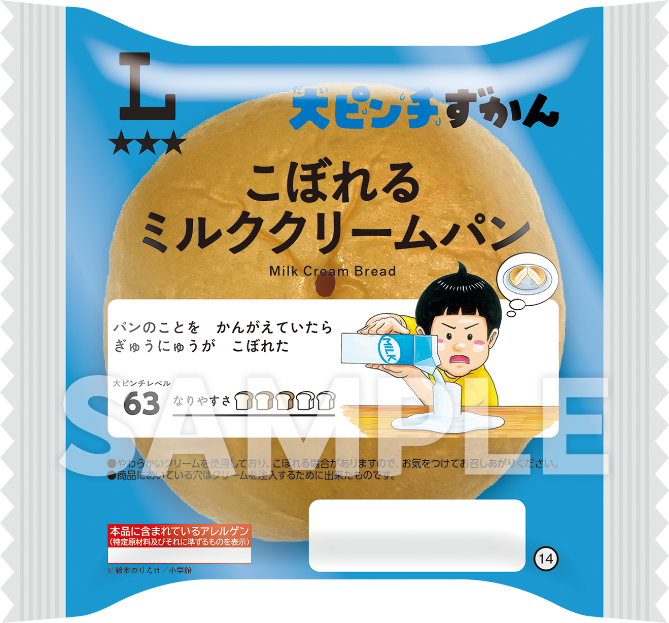 『大ピンチずかん』1巻の表紙にもなってい、る鈴木のりたけさんの次男が牛乳をこぼしてしまった失敗をモチーフにしたとみられる菓子パンで、イラストや「大ピンチレベル」がデザインされています。