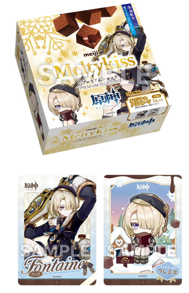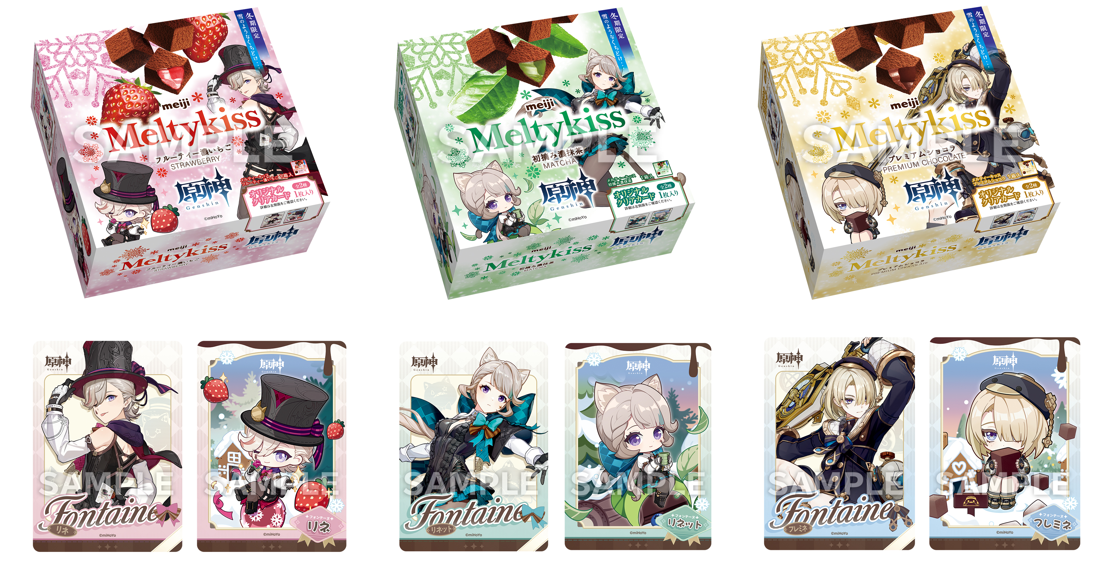 原神×明治×ローソンのオリジナルコラボフードが登場。『原神』クリアカードが付いた「メルティーキッス(濃いちご) / (濃抹茶) / (プレミアムショコラ)」が全国のローソンで1月20日(火)から店頭販売。価格は各899円(税込)。