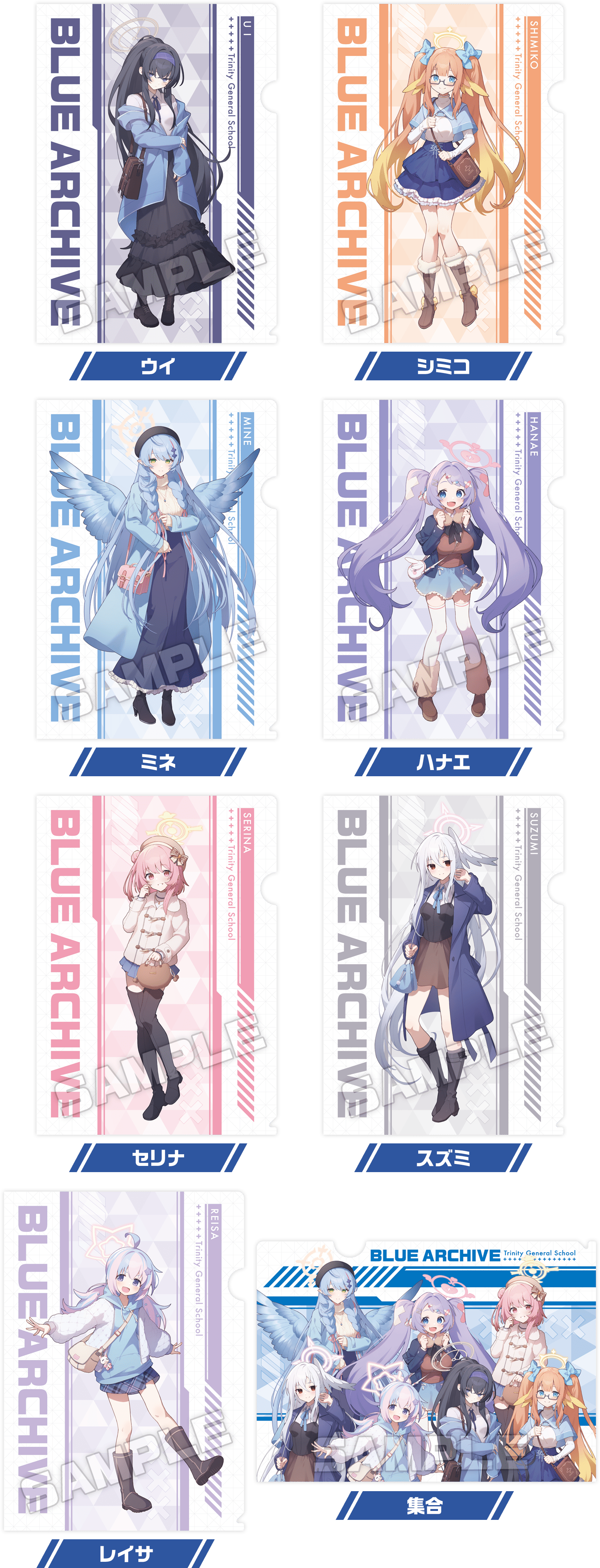 クリアファイルはレイサ、スズミ、ハナエ、ミネ、セリナ、ウイ、シミコのソロデザインが各1種、集合デザインが1種の全8種類が用意。