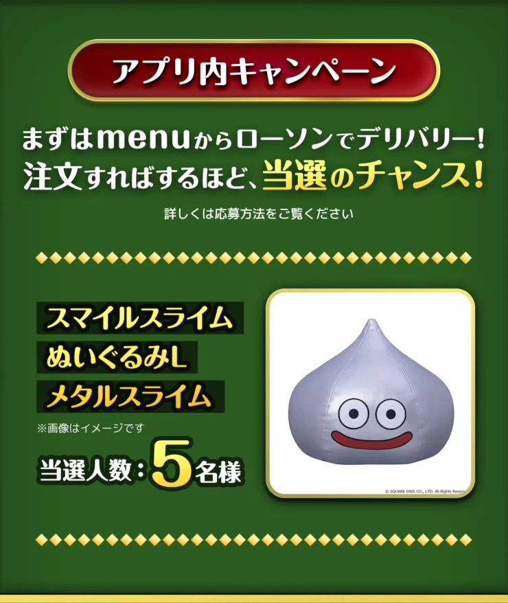今回のキャンペーンは、デリバリーアプリ「menu」からローソンで商品を注文すると、「スマイルスライムぬいぐるみL メタルスライム」が抽選で3名に当たるというもの。