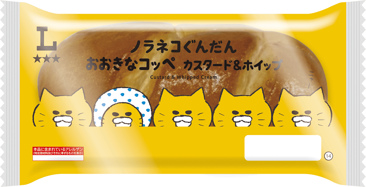 ノラネコぐんだんがパッケージにデザインされた菓子パンで、全国のローソン(一部店舗・ナチュラルローソン・ローソンストア100を除く)にて取り扱い。沖縄地域では取り扱いはないそうです。