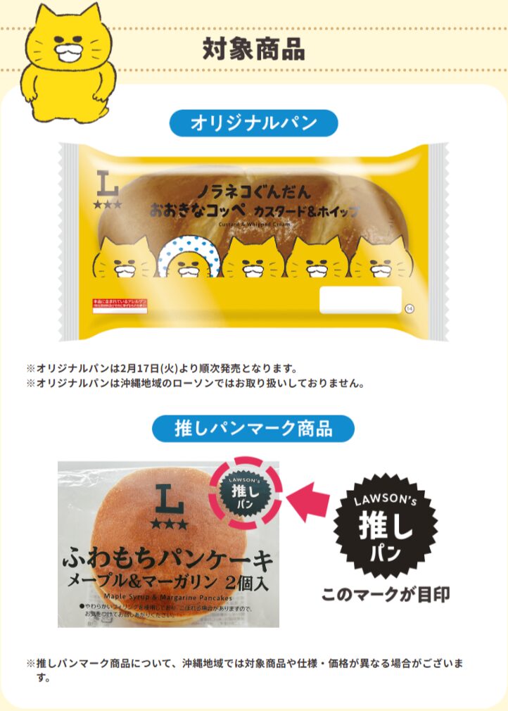 対象のパンは「ノラネコぐんだん おおきなコッペ カスタード&ホイップ」と「LAWSON’s 推しパン」マークが付いた商品。配布期間は3月2日(月)までとされていますが、景品が無くなり次第、終了となります。