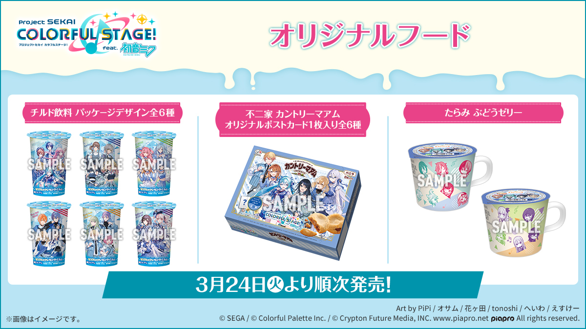 プロセカコラボ「リズミックレモンライム」「不二家 カントリーマアム」「たらみ ぶどうゼリー」はローソンの一部店舗で3月24日(火)から順次販売が開始され、取り扱い店舗についてはローソンの特集ページで確認可能。