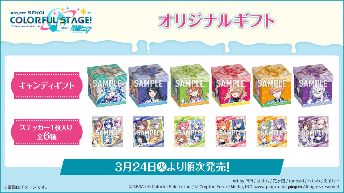 「ステッカー」がオマケで付いたギフトで、ピーチ味のキャンディ入り。ボックスにはプロセカのキャラクター達がデザインされ、展開することも可能となっています。