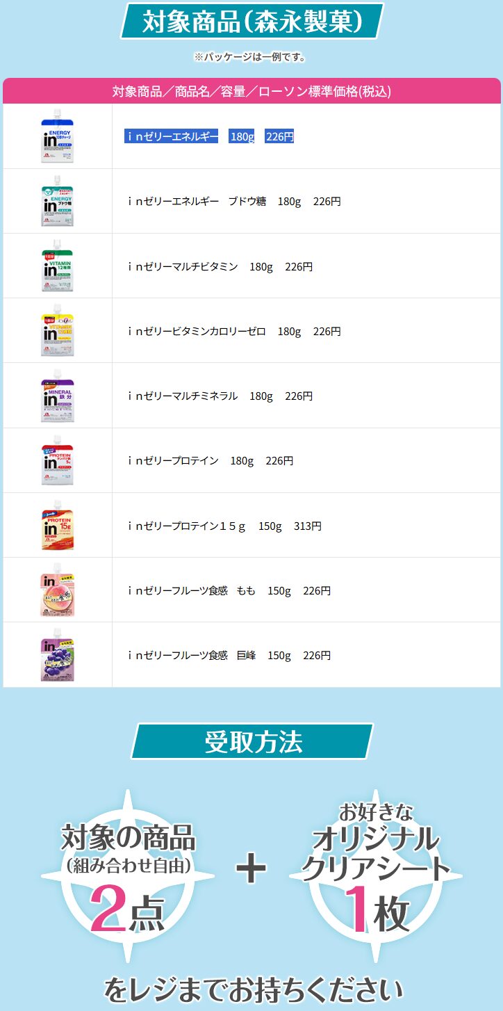 対象の商品は「森永製菓 inゼリーエネルギー 180g」(税込226円)など。配布期間は4月6日(月)までとされていますが、景品が無くなり次第、終了となります。