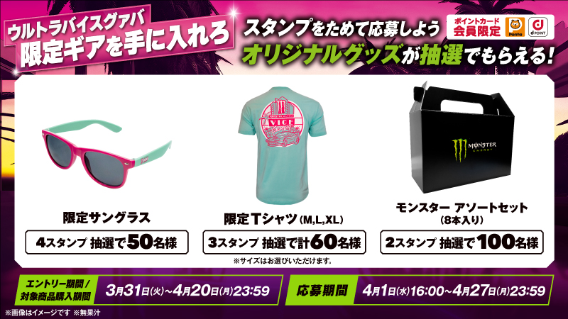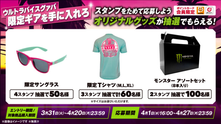 このほか、モンスター ウルトラバイスグァバデザインの「限定サングラス」や「限定Tシャツ」などが当たるアプリキャンペーンも実施。
