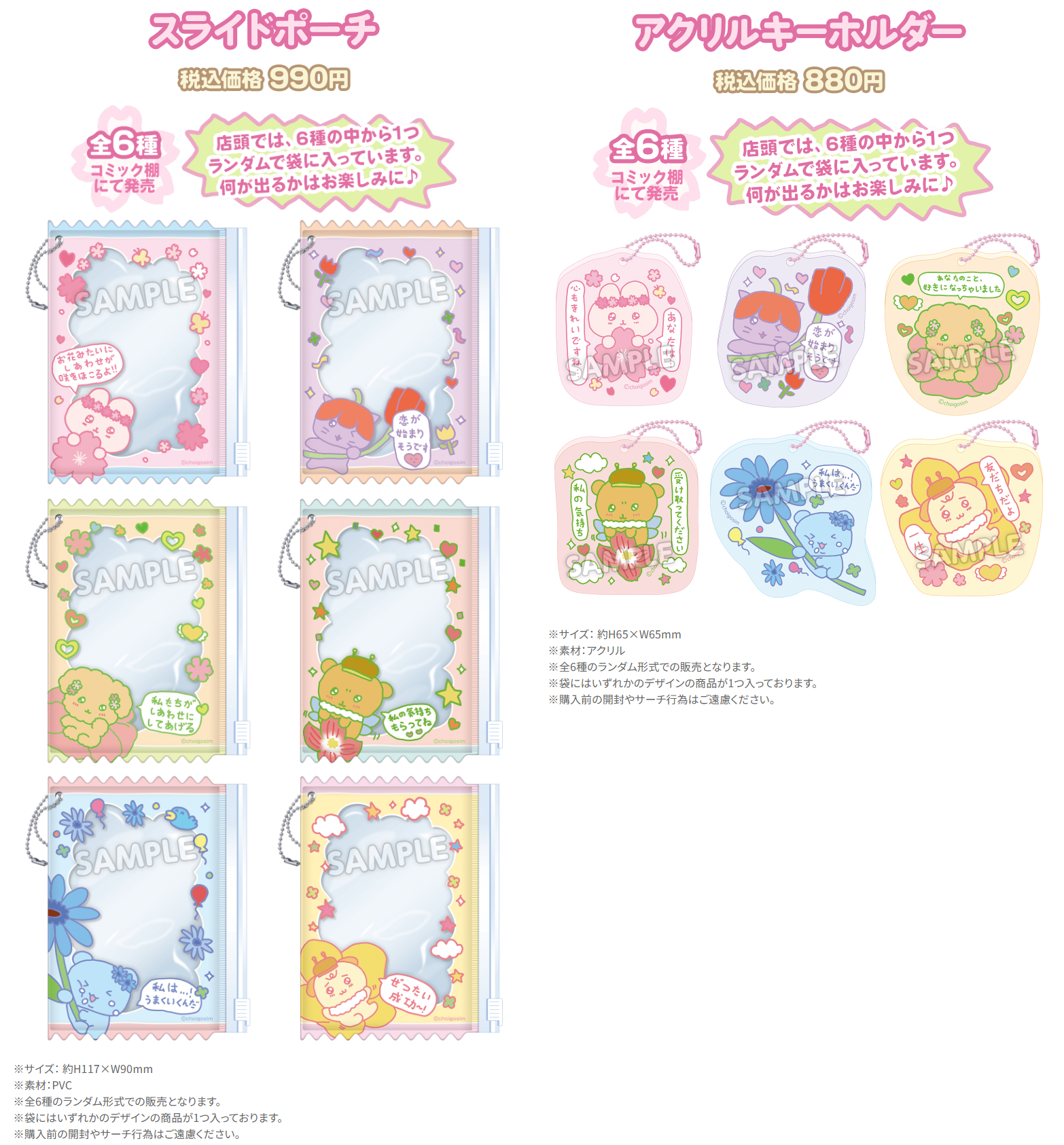 スライドポーチ / アクリルキーホルダーともに全6種類がラインアップされ、いずれも全6種の中から1種がランダムで封入されるブラインドパッケージにて提供されます。