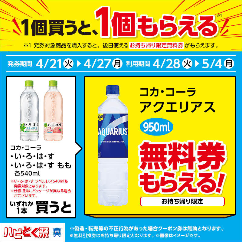 「コカ・コーラ い・ろ・は・す 540ml」など対象の飲料を買うと、後日「コカ・コーラ アクエリアス 950ml」をもらえるお得なキャンペーンが2026年4月21日(火)から始まっています。購入期間は4月27日(月)まで。