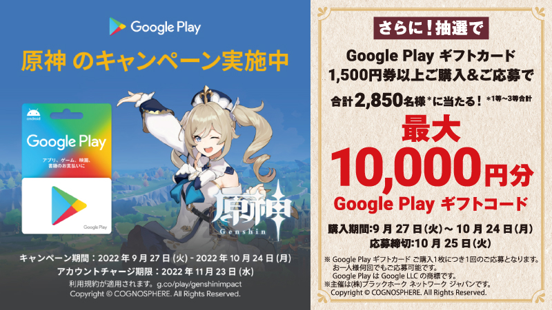 キャンペーン期間中にローソンで「Google Play ギフトカード」の1,500円券以上を購入し、アカウントチャージを行うことで、原神のゲーム内アイテムがもらえるキャンペーンが実施。