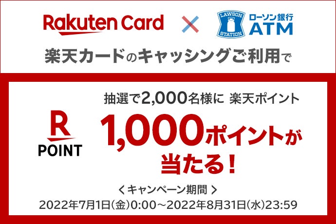 ローソン銀行ATMで楽天カードのキャッシングを利用した人を対象に、抽選で2,000名に楽天ポイントが当たるキャンペーンが始まりました。期間は7月1日(金)0:00~8月31日(水)23:59。