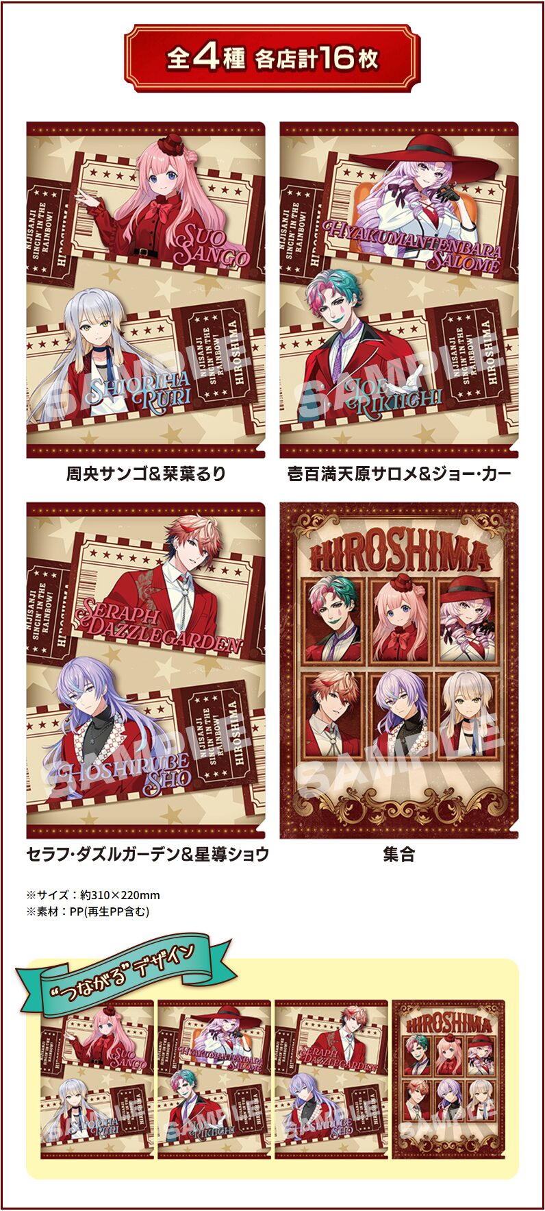 2025年10月18日(土)に広島文化学園HBGホールで開催される、にじさんじ7周年ライブツアー「にじさんじ WORLD TOUR 2025 Singin’ in the Rainbow! 広島公演」(にじさんじSitR広島公演)のビジュアルを使用したクリアファイルで、全4種類がラインアップ。
