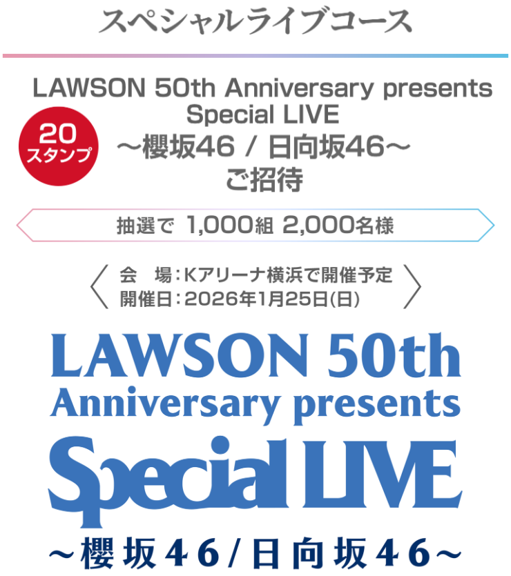 抽選でローソンスペシャルライブご招待が当たる櫻坂46 日向坂46ローソンアプリでたまるよスタンプを実施します!