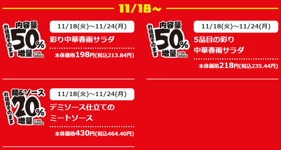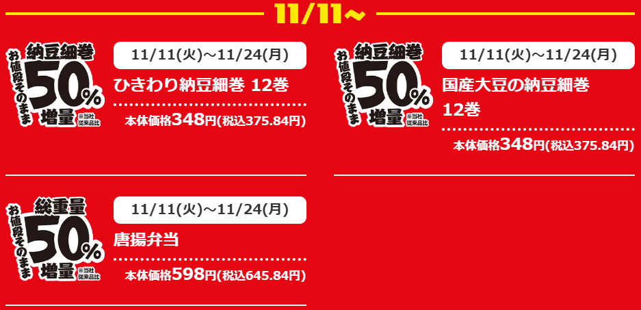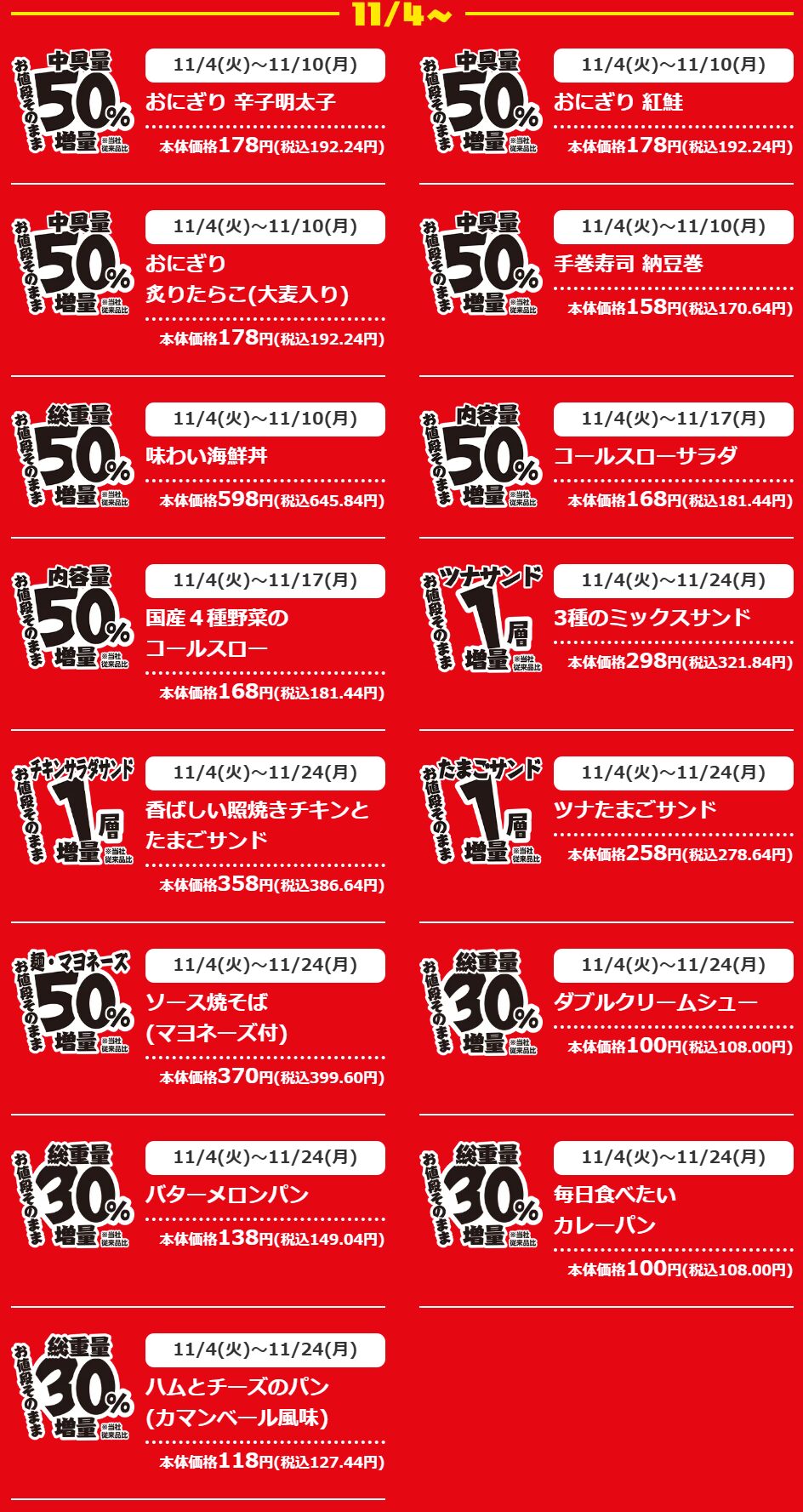 Xフライドポテトや対象のおにぎり、唐揚弁当、納豆巻、海鮮丼、焼きそば、コールスローなどが50%増量、対象の菓子パン、ダブルクリームシューが30%増量、ウインナーを2本入れたホットドッグ(ダブルウインナー)、対象のサンドイッチ1層増量など、全22商品が11月4日(火)から順次展開されます。