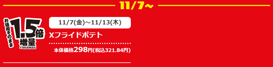 - 【1.5倍増量】「Xフライドポテト 1.5倍」:321.84円(税込)