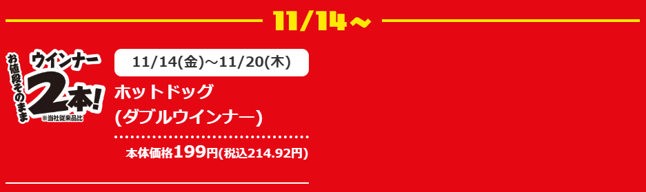- 【ウインナー 2本】「ホットドッグ(ダブルウインナー)」:214.92円(税込)