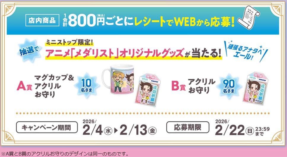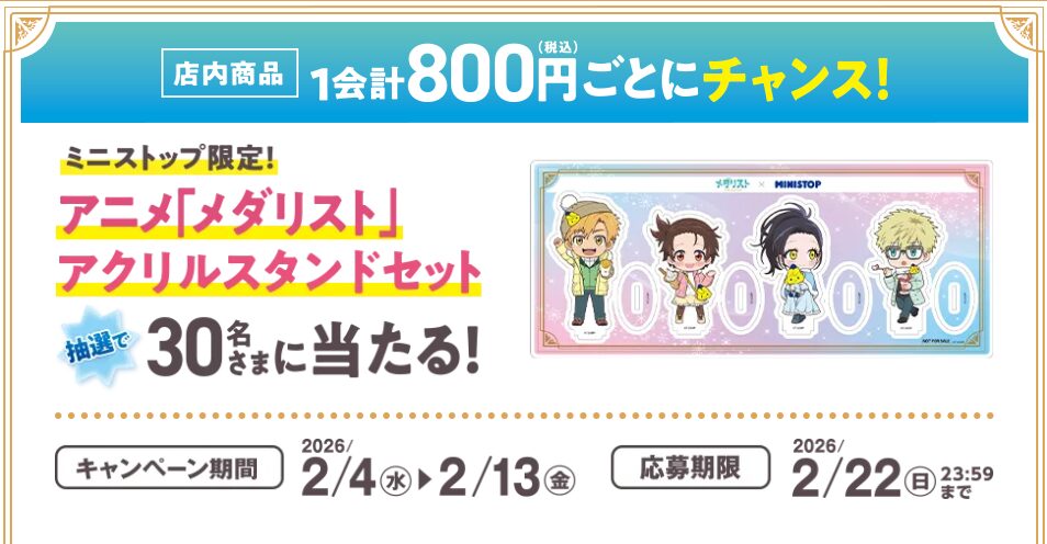 ミニストップアプリの会員バーコードをスキャンし、ミニストップで1会計800円(税込)以上の買い物をすると、「アニメ『メダリスト』アクリルスタンドセット」が当たるアプリ抽選会に応募できるキャンペーンが、2026年2月4日(水) ~ 2月13日(金)まで実施。